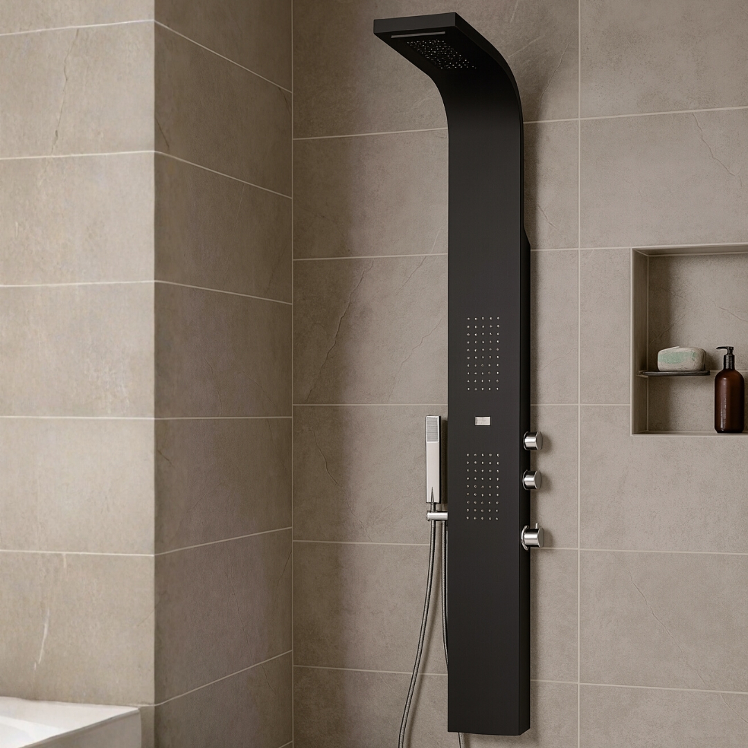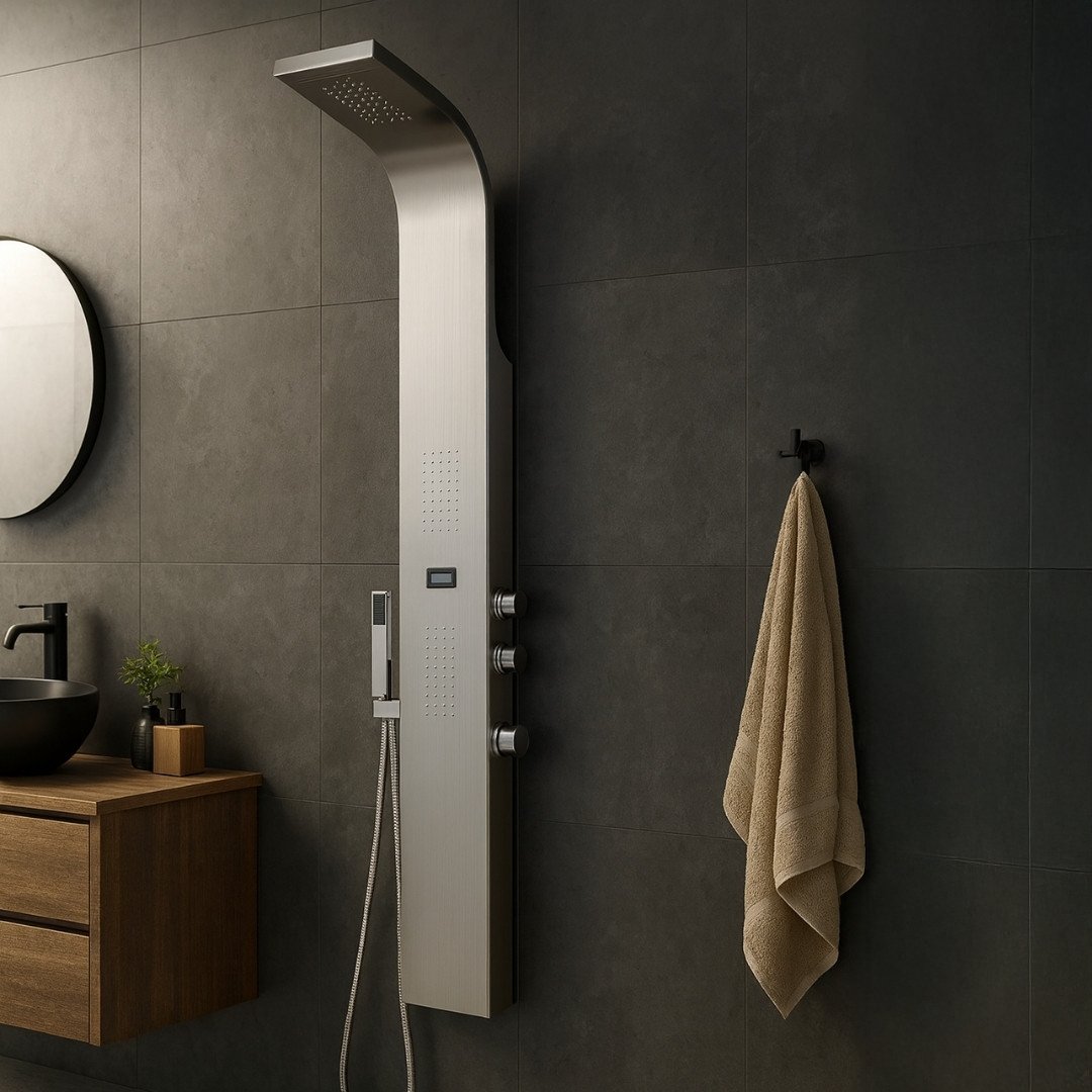 Une colonne de douche hydromassante, c’est un panneau vertical qui regroupe plusieurs fonctions d’eau sur un même équipement :