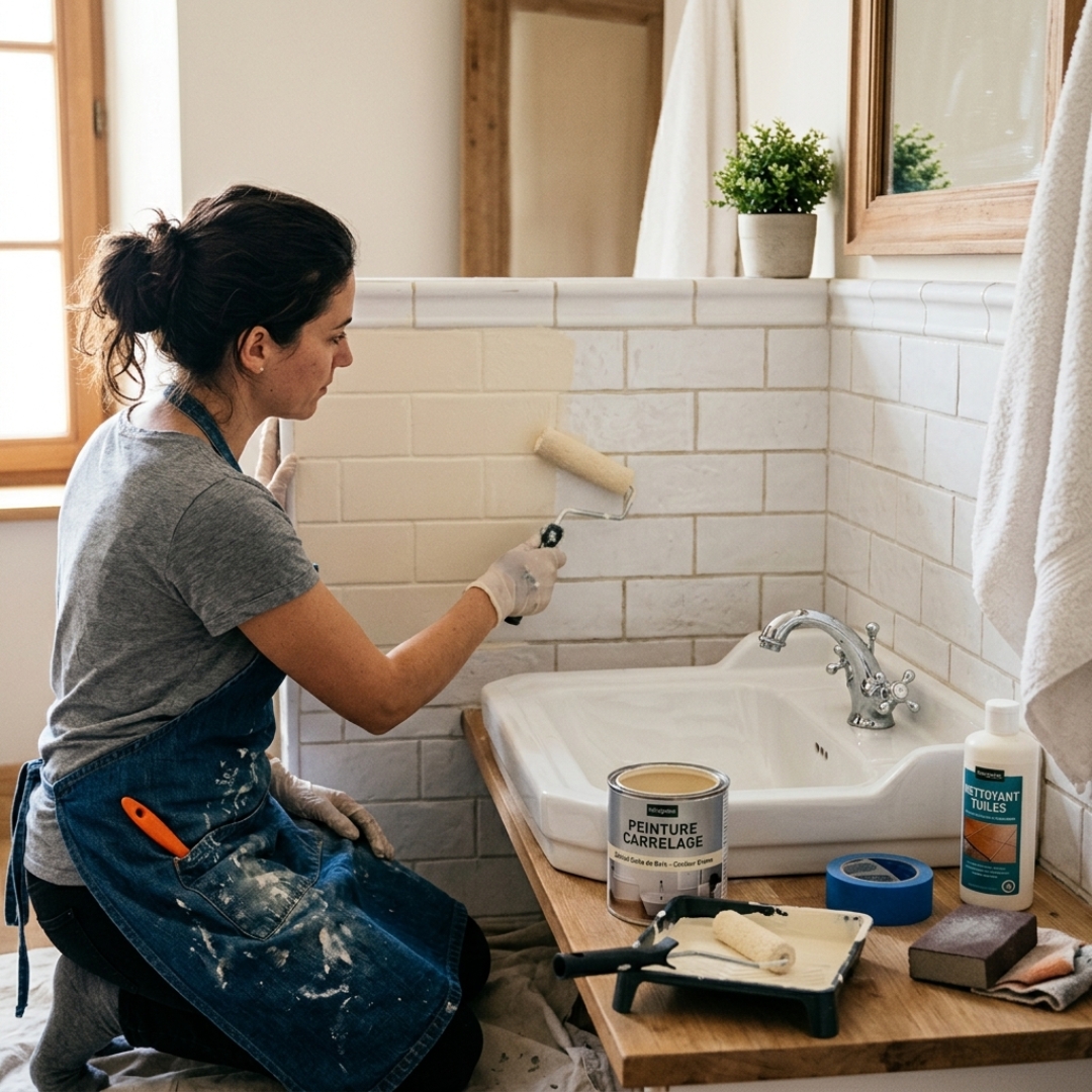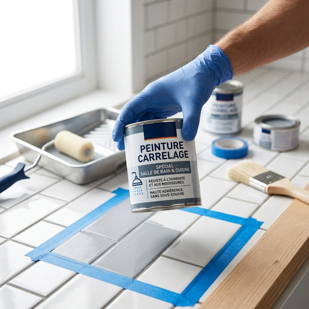 C’est un point essentiel. On ne repeint pas du carrelage de salle de bain avec une peinture prise au hasard. Il faut un produit adapté aux pièces humides et capable d’adhérer sur une surface lisse.